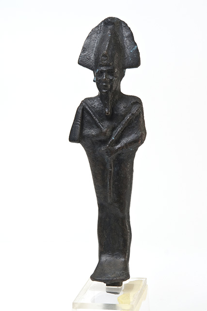 Statuina in bronzo che raffigura il dio Osiride mummiforme con in capo la corona bianca dell'alto Egitto affiancata da due piume di struzzo. Sulla corona dell’Alto Egitto è presente un cobra (l’ureo). Il dio è stante, con la barba divina sul mento e con le mani una sopra l'altra sul petto, che reggono lo scettro-heqa nella mano sinistra e il flagello-nekhekh nella destra. Sotto i piedi vi è un perno per l'infissione in una base.
