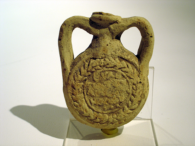Ampolla piatta in argilla chiara, mancante del collo e ottenuta da matrice consunta. Sul lato A, entro una cornice perlinata, si vede San Menas, in abito militare e in atteggiamento di preghiera. La testa è incorniciata da un nimbo; ai lati del corpo vi sono due cammelli, stretti lungo il margine del medaglione. Sul lato B, entro una corona d’alloro con foglie stilizzate, vi è un’iscrizione in quattro righe e conclusa tra tre piccole sfere a rilievo. Solo la prima delle righe è leggibile: EVΛO, l’inizio della parola “eulogia”.