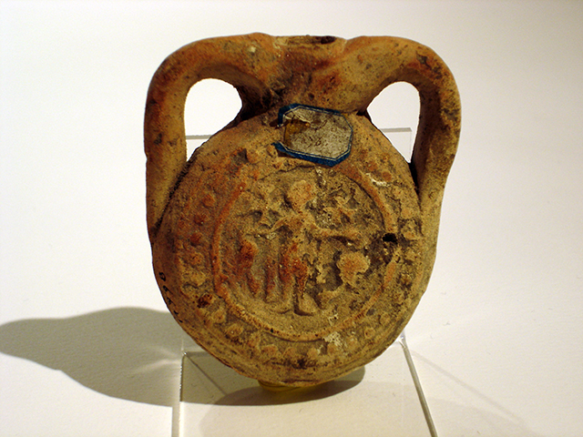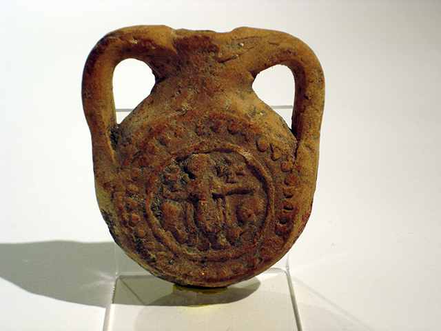 Ampolla piatta in argilla rosata, ottenuta da matrice alquanto consunta. Sulle due facce del disco piano, una cornice a globetti entro un doppio anello rilevato racchiude lo stesso motivo decorativo: San Menas in piedi al centro, in veste militare e in posizione di orante, si trova tra i due cammelli. Le due croci ai lati della testa del santo sono di forme diverse: sul lato A quella di sinistra ha i bracci a coda di rondine, mentre quella a destra è apicata; sul lato B la posizione è all’inverso.