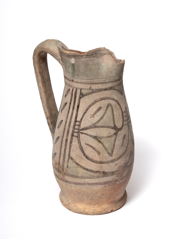 Brocca con ventre poco rilevato e bocca trilobata; ansa a nastro costolato; piede estroflesso con base piatta. Decorazione a punta di pennello a bande, anche sul manico, e grande motivo a foglie di pioppo.