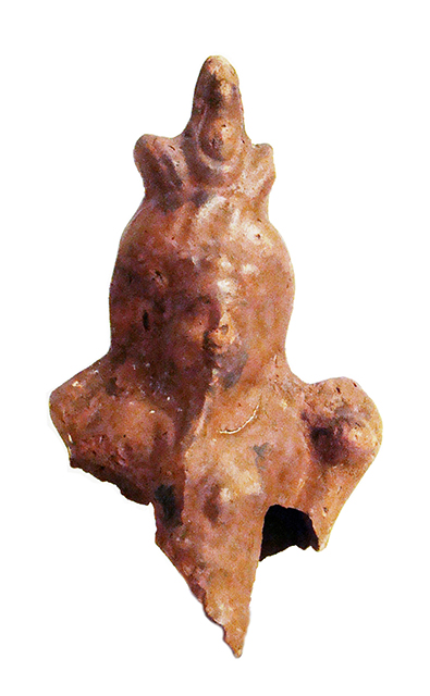 Le statuina, modellata in stampo dall’interno cavo, conserva tracce di ingobbiatura, ma è spezzata all'altezza del busto. Raffigura il dio Arpocrate, che con il braccio destro piegato porta il dito indice alla bocca; con il sinistro sorregge, poggiandola alla spalla e al fianco, una cornucopia (di cui si vede la parte superiore). A destra del volto si intuisce la treccia caratteristica dell’età infantile e sul capo la corona pscent affiancata dai due boccioli di loto. Sul retro presenta una elaborata acconciatura che al centro della nuca termina in una trecciolina ed è formata dall’annodarsi dei nastri lunghi fino alle spalle.