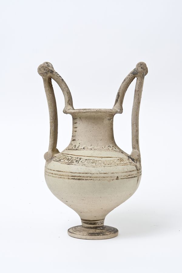 Trozzella in ceramica messapica. Orlo estroflesso e appiattito, alto collo cilindrico, a profilo leggermente concavo, corpo globoso, con anse verticali sormontanti, impostate sull’orlo e sulla spalla, provviste di doppia coppia di dischi (“trozze”), di cui quelli superiori sono di maggiori dimensioni; piede a disco, unito al corpo mediante un piccolo fusto. Decorazione monocroma in bruno su fondo naturale di argilla, con piede dipinto; risparmiata la costa laterale del piede; sul collo, linee orizzontali diritte con motivo a ovoli nella fascia inferiore di un lato, a onde correnti in quella dell’altro lato; sulla spalla, una serie di pannelli definiti da linee parallele, in cui su un lato campeggiano due palmette rovesciate e un sole (o rosetta) al centro, mentre sull’altro una fascia rettangolare con riquadri all’interno. All’altezza del ventre, una fascia a tre linee parallele; sul fusto del piede, fasce e una linea; sull’orlo, tratti; sui dischi linee radiali.
