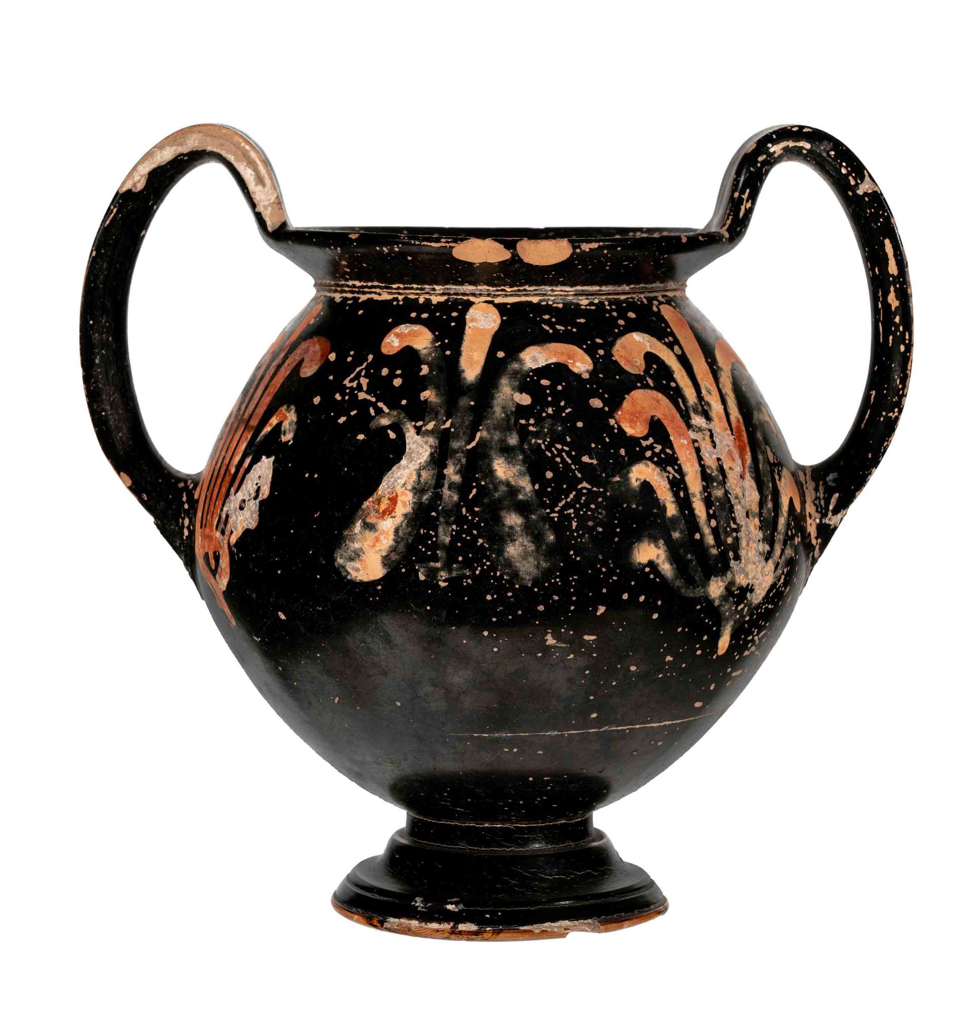 Vaso kantharoide a figure rosse con immagine di grifo in corsa tra viticci. Sull'altro lato palmette.