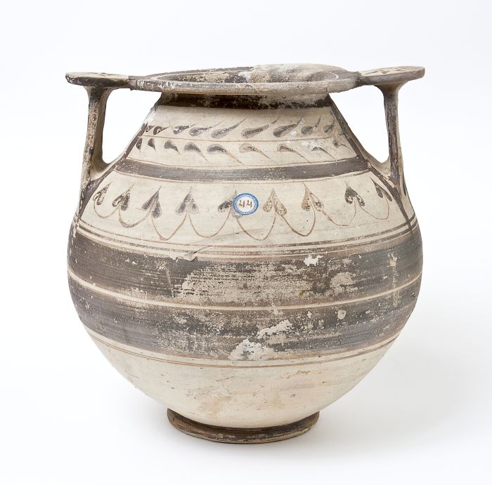 Olla in ceramica messapica con due anse verticali in forma di scalpello unite al labbro mediante rotella. Basso collo troncoconico a profilo convesso, corpo globoso, piede a disco. Decorazione monocroma in bruno su fondo di argilla naturale, su entrambi i lati: sul collo, riquadro con ramo di foglie lanceolate; sulla spalla, foglie lobate unite da archetti su un lato, serti con foglie d’edera sull’altro; sul ventre, fasce di colore bruno; sulle rotelle, giro di foglie uscenti dal centro di esse; sulle anse, due riquadri separati da doppie linee parallele, con serti d’edera; orlo e piede interamente dipinti.