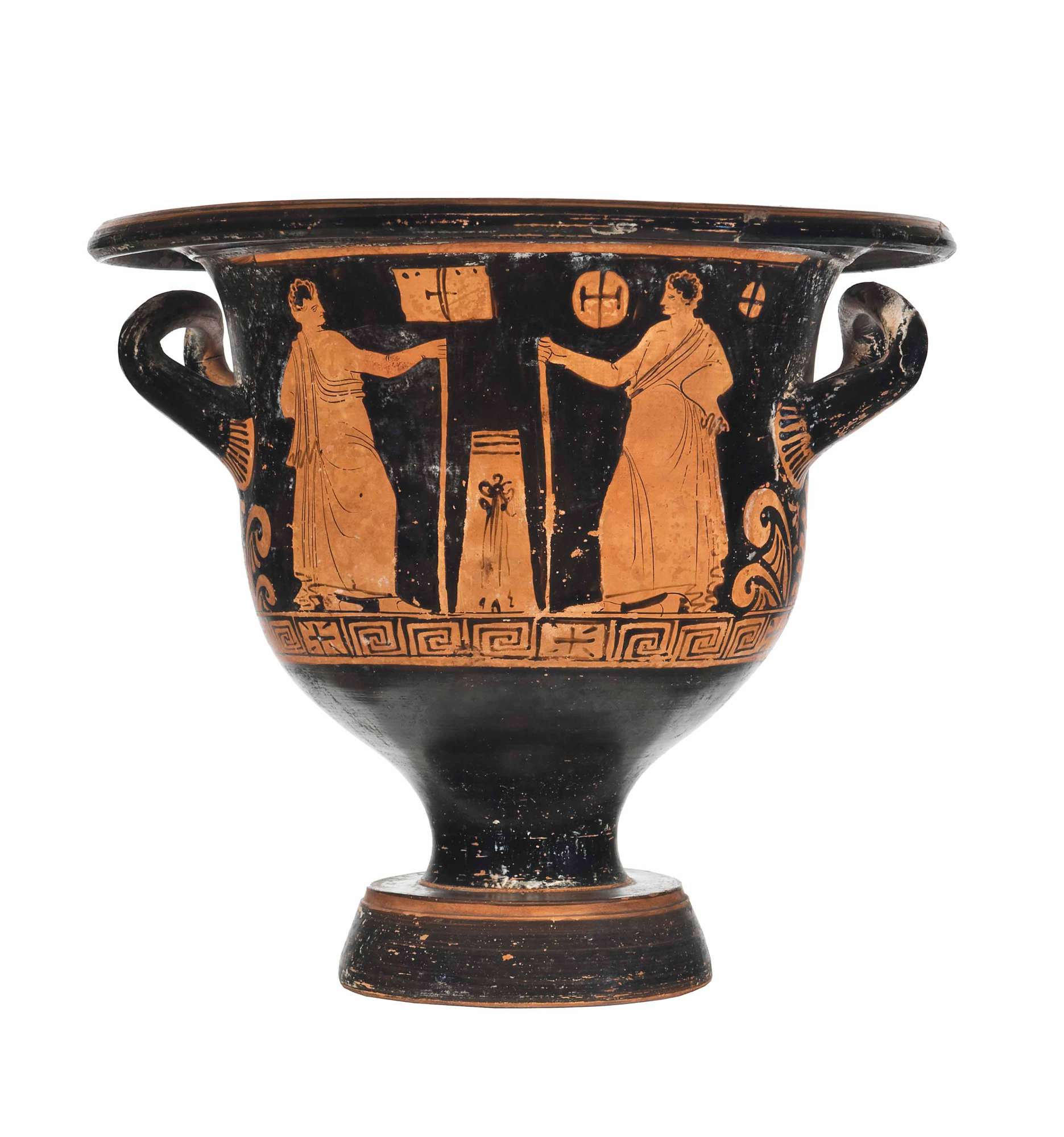 Cratere a campana apulo a figure rosse. Lato A: una giovane donna seduta su roccia tiene uno specchio e una patera; un giovane nudo regge una situla; Lato B: due giovani ammantati offerenti verso una stele sepolcrale cinta di bende.