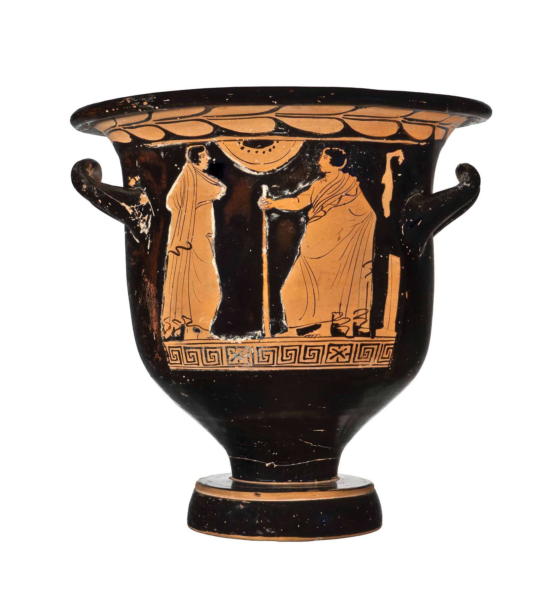 Cratere a campana a figure rosse. Lato A: parodia della contesa del tripode: Eracle con clava insegue Sileno con tripode sulle spalle; Lato B: due giovani vestiti di mantello.