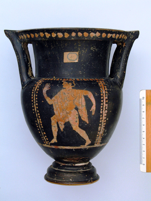 Cratere a colonnette con decorazione sovradipinta. Lato A: atleta nudo in corsa, comasta?; Lato B: uomo ammantato con oggetto in mano accanto ad albero.