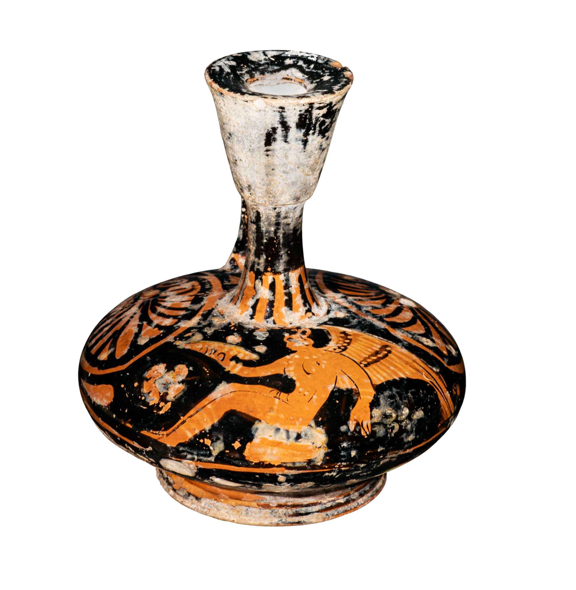 Largo bocchello svasato, collo a profilo concavo distinto dal corpo da un sottile cavetto; ansa a nastro con costolatura mediana; corpo fortemente schiacciato e distinto, per mezzo di un breve stelo a risparmio. Lato A: erote seduto con phialè Erote seduto, rivolto verso sinistra, con testa e gambe di profilo; caratterizzato dalla presenza di numerose decorazioni sovradipinte in giallo, porta i capelli raccolti in una mitra; le ali, profilate in bianco (in gran parte evanido) sono caratterizzate da linee verticali in bianco diluito che simulano il piumaggio. Armillae ai polsi, collana a due file di vaghi circolari – uno girocollo, l'altro a tracolla e ricadente sul petto –, decorazione sulla coscia e cavigliera rigida a più cerchi, tutti sovradipinti. Seduto su roccia stilizzata con parte superiore campita in bianco, Con la sinistra stringe tra le dita un ramoscello sovradipinto, mentre con la destra regge una cista, profilata e decorata nello spessore da una corona di tratti sovradipinti; al di sopra, offerte in bianco sovradipinto. Nel campo, rosetta quadripetala con bottone centrale sovradipinto.