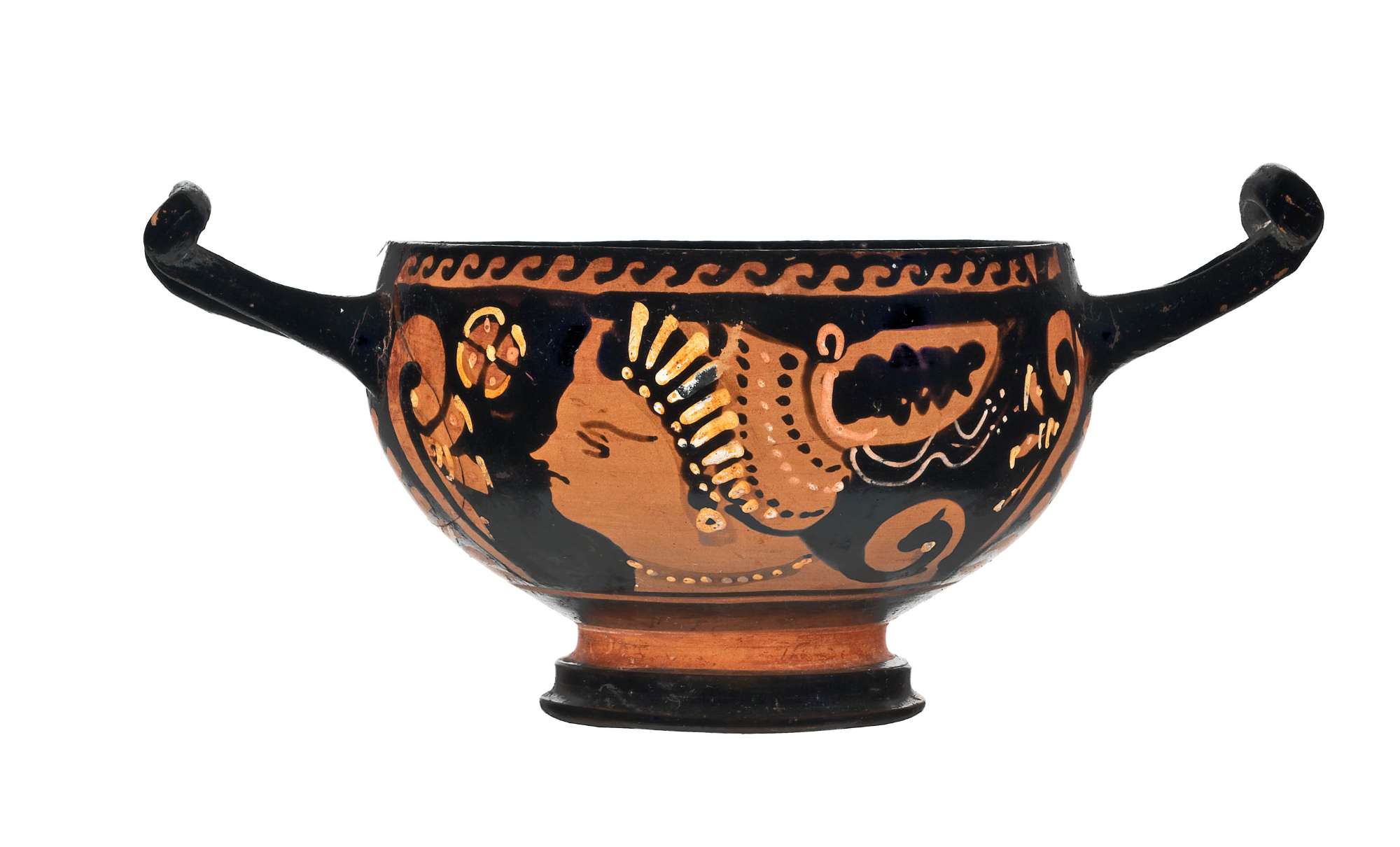 Coppa biansata apula a figure rosse ad anse ricurve sotto cui vi sono palmette. Lato A: testa femminile con mitella; Lato B: testa di donna in atto di gridare? Gorgone?