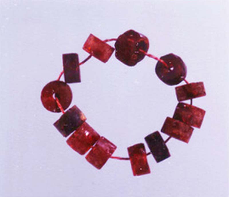 Vaghi cilindrici in ambra giallo-rossa con foro centrale.
