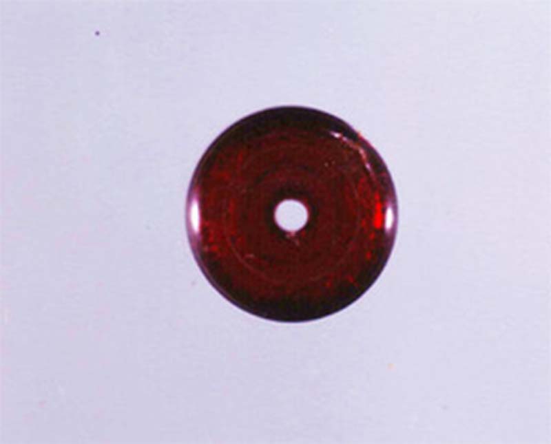 Dischetto realizzato in ambra scura rossastra con una faccia piana e l'altra leggermente convessa, con foro centrale. presenta come decorazione una doppia incisione concentrica al torno sulla faccia piana, una sulla convessa e una sul bordo.