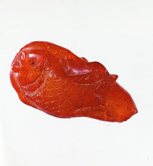Placchetta realizzata in ambra giallo-dorata con figura a rilievo, concava inferiormente, raffigurante un pesce guizzante verso sinistra, reso in modo naturalistico.