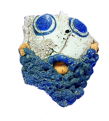 Perla in vetro blu, giallo, bianco e azzurro opaco realizzatacon la tecnica a fusione su nucleo friabile. Configurata a volto barbuto con grandi occhi rotondi e foro verticale.
