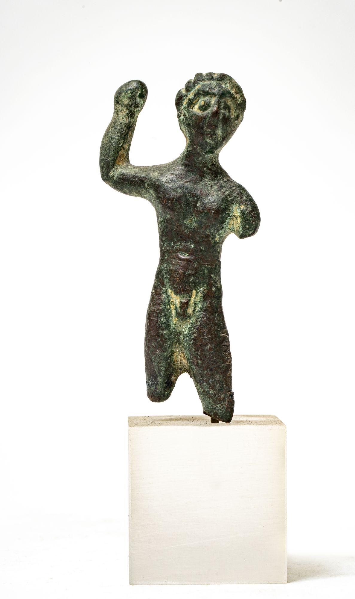 Statuetta d'Ercole con il braccio destro alzato a colpire con la clava, mancante. Patina verde.