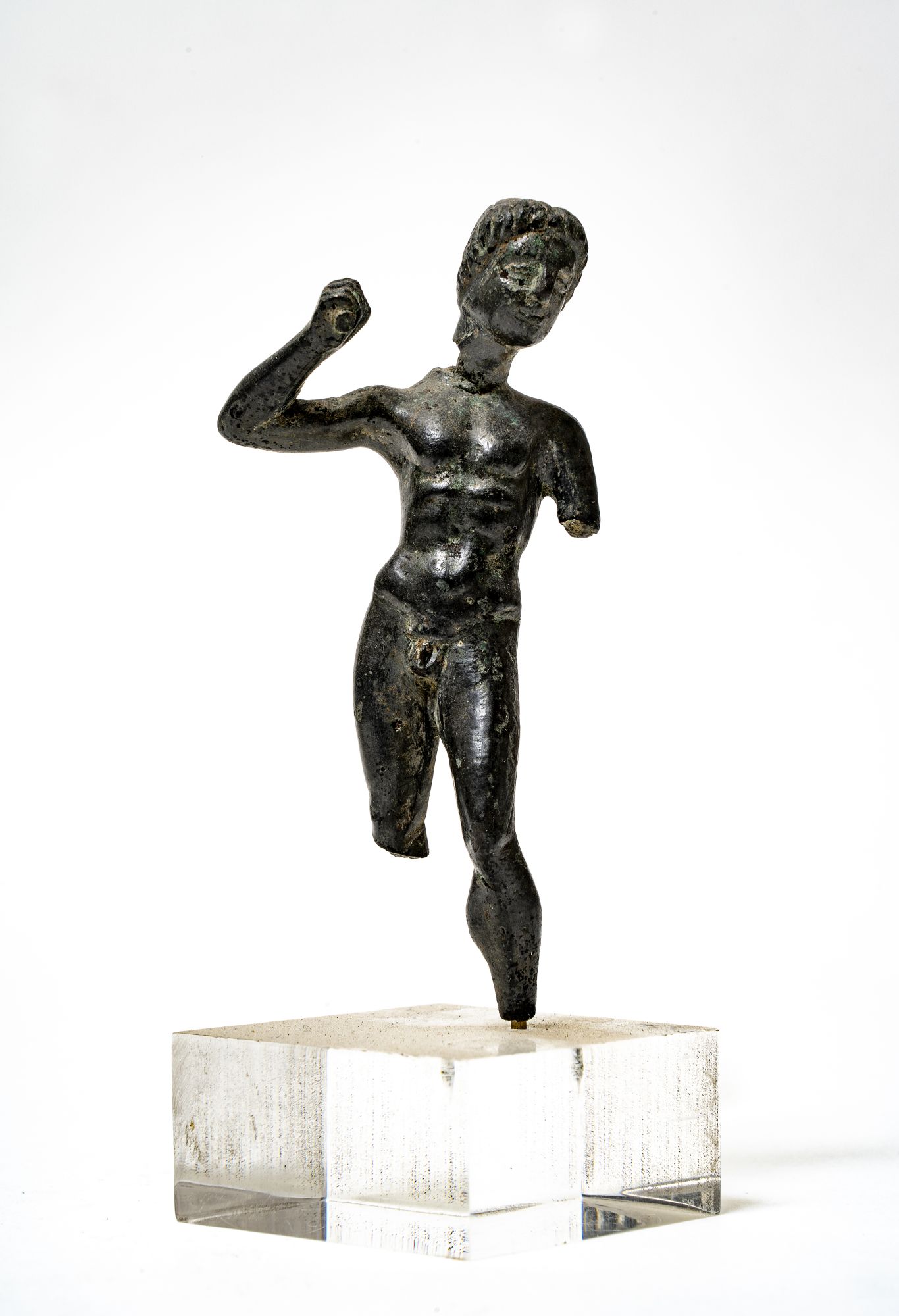 Figurina ignuda d'Ercole il braccio è alzato con in pugno un manico di clava. Capelli striati a cono. Arcaismo nel volto. Raffigurato in movimento vivace, col capo rivolto a sinistra.