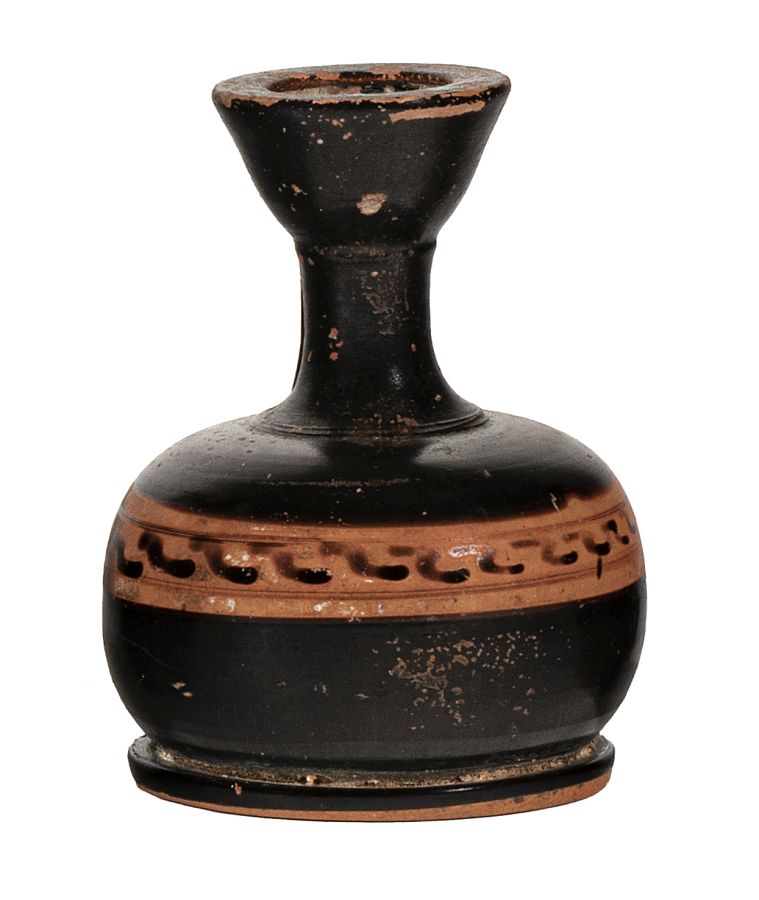 Lekythos miniaturistica a corpo globulare attica con fascia a risparmio con decorazione a meandro