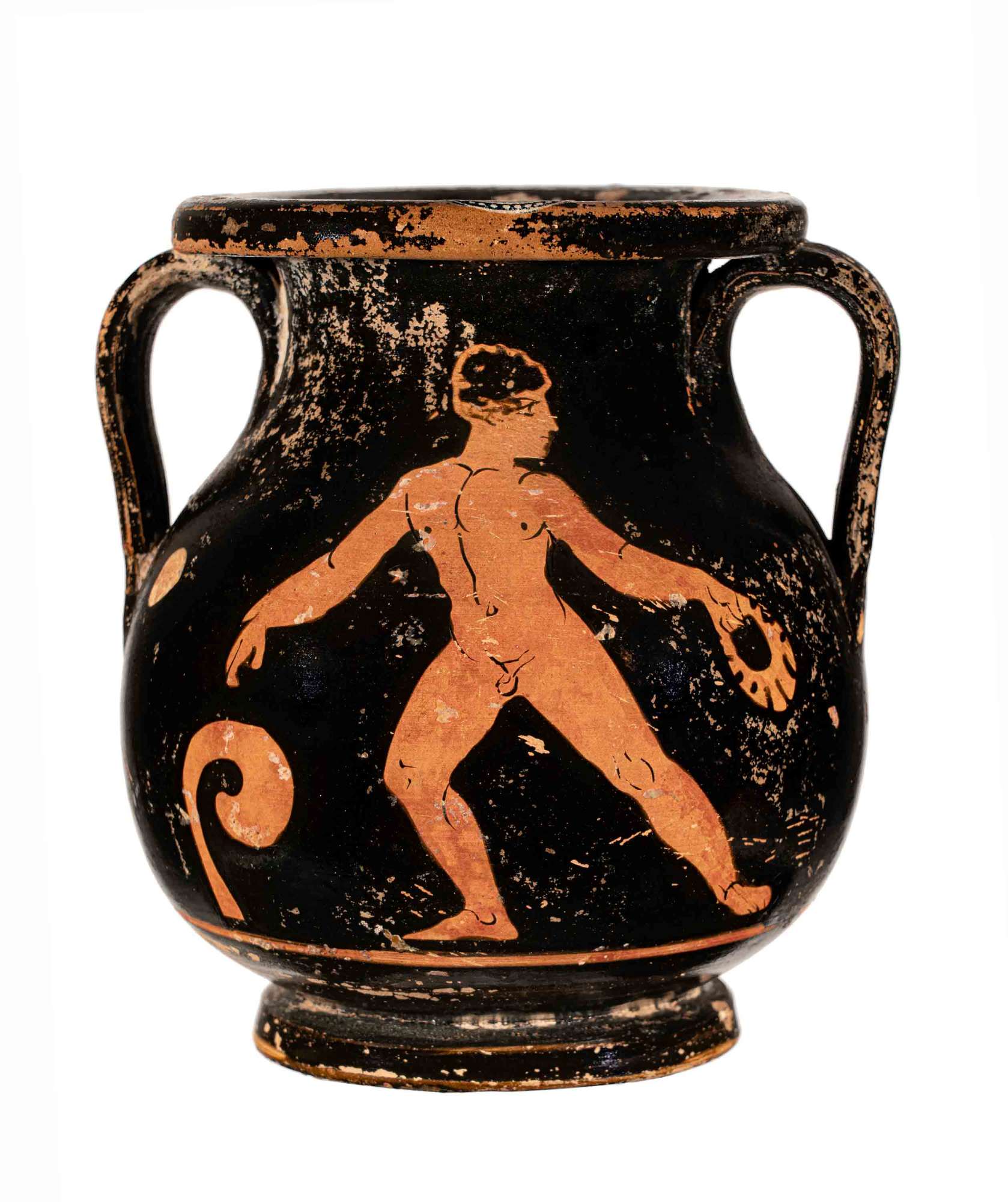 Pelike attica a figure rosse. Lato A: Fanciulla in chitone succinto ai fianchi; in corsa. Lato B: giovane nudo in corsa con serto fiorito in mano.