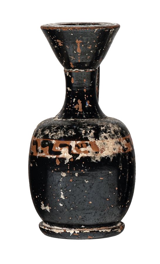 Lekythos miniaturistica a corpo globulare attica con fascia a risparmio con decorazione a meandro