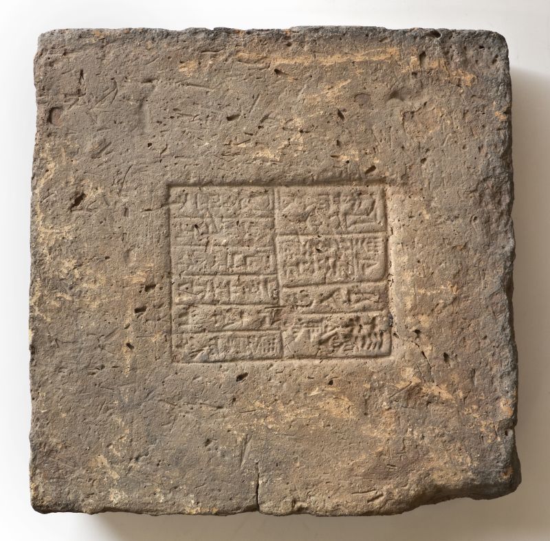I mattoni in argilla sono ascrivibili a Gudea, re di Lagaš, della fine del III millennio a.C., e sono molto probabilmente riferibili all’Eninnu, il tempio di Ningirsu edificato da Gudea a Girsu (l’odierna Tello in Iraq). Su entrambi i mattoni è riportata copia della medesima iscrizione di fondazione che celebra i lavori di costruzione e ristrutturazione del tempio a opera del sovrano della città. Si tratta dell’impresa edilizia più nota e celebrata di Gudea che fu molto attivo come costruttore. Questa versione dell’iscrizione è la più diffusa: sono noti altri 33 esemplari su mattoni, oltre a numerose copie su altro supporto come coni d’argilla, perni di porta, tavolette di pietra e diorite, e blocchi di calcare. Sono attualmente noti 1173 esemplari dell’iscrizione.