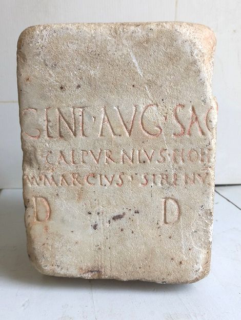 Piccola base parallelepipeda, priva di cornice e modanature, in marmo rinvenuta a Roma nel 1891. La rubricatura delle lettere non è antica. Sono visibili tre fori nella faccia superiore, dei quali quello centrale conserva residui di piombo per il fissaggio, mentre le altre due sono di reimpiego, come il foro nella faccia posteriore, pesantemente rilavorata.La base originariamente recava fissato nella faccia superiore il vero oggetto della dedica di Gaio Calpurnio On... e Marco Marcio Sirino, una statuetta o un altro oggetto in metallo, poi andato perduto. Il tono della dedica ci fa intuire che alla famiglia imperiale è attribuita una valenza divina, non diversa da quella goduta dai singoli imperatori che non solo dopo morti ma spesso anche da vivi erano considerati e onorati come veri e propri dei.