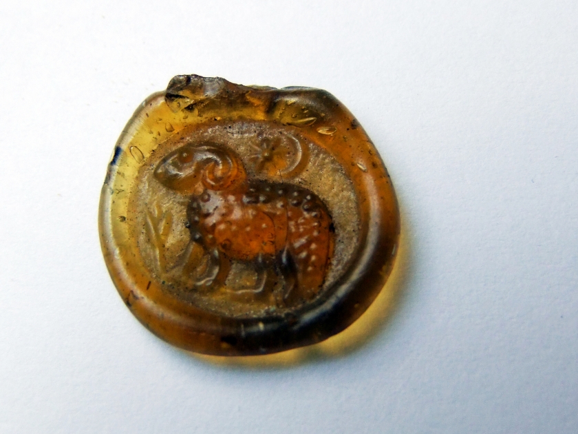 pendente di forma circolare: decorazione data da agnello stante a sin.; pelame reso da fitta rete di punti rilevati. Linea di base, da cui , a sin. dell'animale, sorge fiore su stelo. In campo, al centro, sopra all'animale, stella a otto punte e crescente lunare con punte volte a sin.