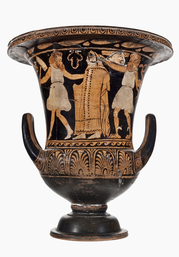 Cratere a calice a figure rosse sovradipinte. Lato A: Al centro la defunta velata e avvolta nel manto viene afferrata da sinistra da Charun armato del caratteristico martello; indossa corta tunica e ha volto e orecchi satireschi. A destra la donna viene sospinta da dal dio Tuchulcha, che indossa analoga tunica e ha viso bestiale con grosso naso adunco, incolta barba, capelli ispidi e dritti e orecchie equine; le sue gambe terminano in artigli di uccello rapace mentre tiene con la sinistra una serpe guizzante. Sulla sinistra chiude la scena un grosso serpente alato. Lato B: Satiro nudo bendato vibra lo strigile sulla groppa di un asino itifallico per spingerlo verso una donna o menade nuda, dipinta di bianco, bendata con collana e chitone.
