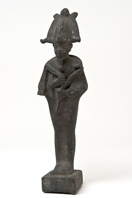 Statuina in bronzo che raffigura il dio Osiride mummiforme con in capo la corona atef, formata dalla corona dell’Alto Egitto affiancata da due piume di struzzo, sormontanti un paio di corna d’ariete ondulate ad andamento orizzontale. Sulla corona dell’Alto Egitto è presente un cobra (l’ureo). Il dio è stante, con la barba divina sul mento e con le mani sovrapposte sul petto, che reggono lo scettro-heqa nella mano sinistra e il flagello-nekhekh nella destra. Sotto i piedi vi è una base quadrangolare che serviva per appoggiare la statuina.