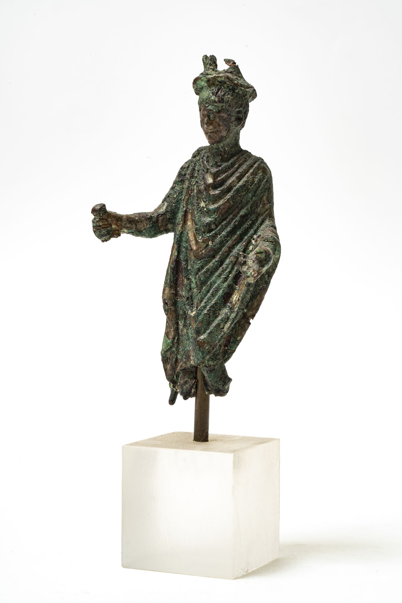 Statuetta di Mercurio. Originariamente reggeva gli attributi che di solito lo caratterizzano. Il capo è coperto dal pètaso, sul quale è visibile una tacca nel punto in cui si impostavano le alette. Il corpo è quasi interamente avvolto da un lungo mantello. Restano tracce dei calzari alati. Il viso, dai tratti poco riconoscibili, è lievemente reclino verso destra. I capelli corti si dispongono a frangetta sulla fronte.
