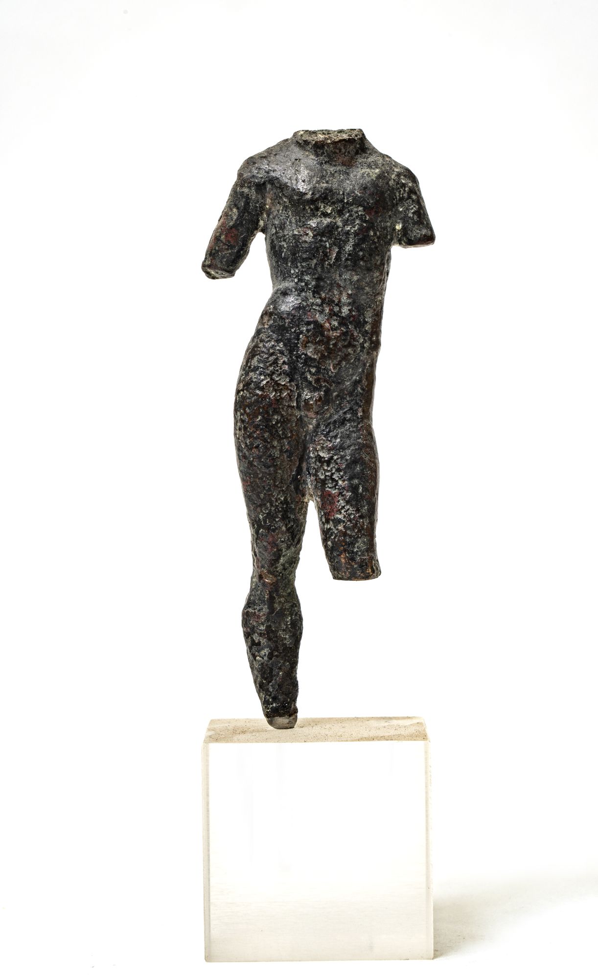 Frammentario; Patina verde chiaro, superficie guasta. Mancano la testa, l'avambraccio destro e il braccio sinistro quasi fino all'ascella, il piede destro e la gamba sinistra sotto il ginocchio.