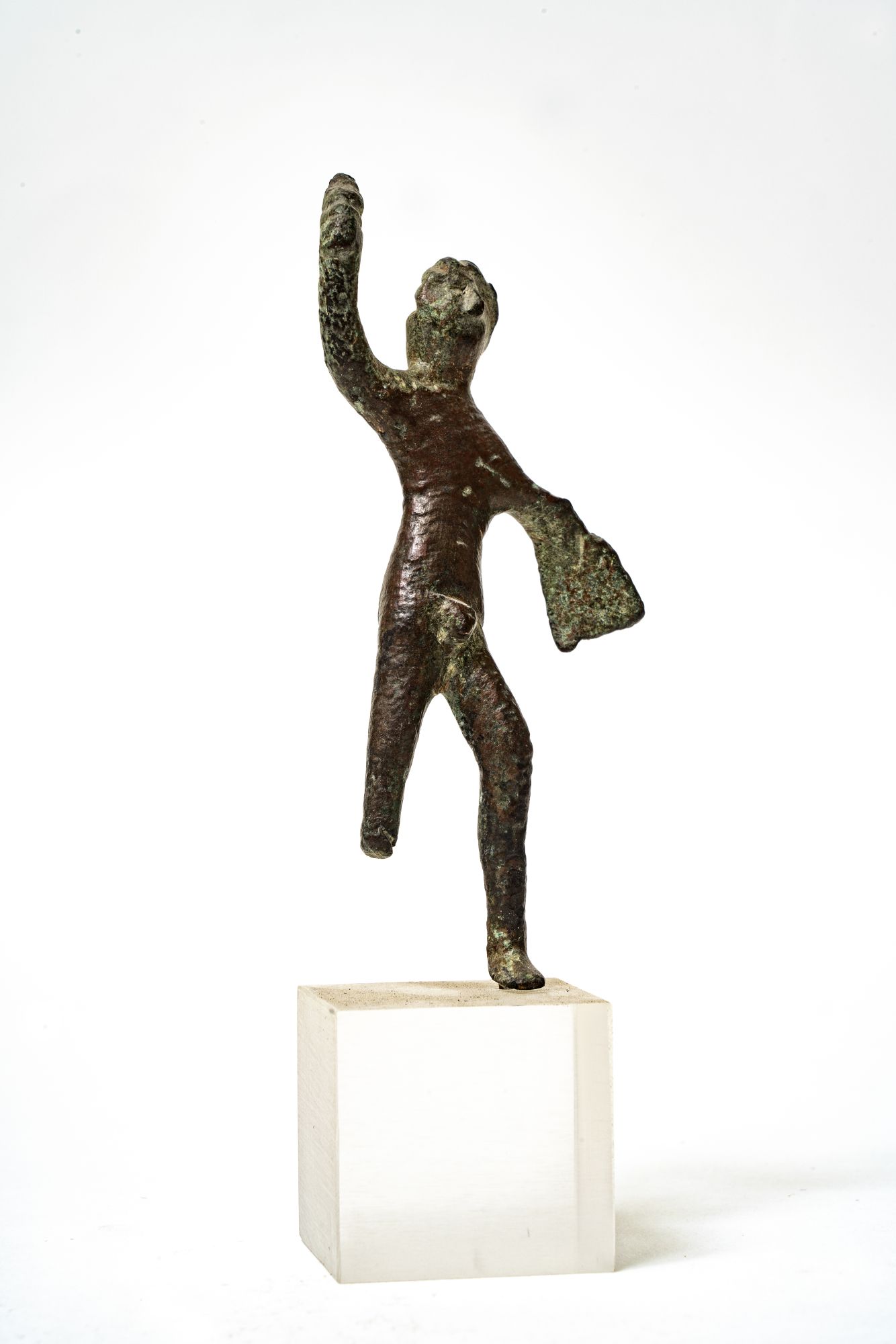 Statuina d'Ercole che regge una clava nella destra sollevata e la pelle leonina nella sinistra, come una spatola. Testa rozza, corpo appiattito, sproporzionate tra loro le braccia. Patina nero-rame.