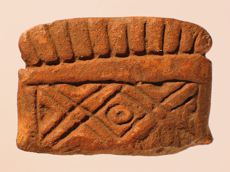 Frammento fittile rettangolare appartenente ad una figurina di stile Usulután. Si tratta probabilmente di parte di un copricapo. È realizzato a lavorazione piena con argilla ingobbiata in color crema rosato. Consiste in un rettangolo decorato ad incisione con un motivo a rombi che ricorda un tessuto. Uno dei lati lunghi è sormontato da una frangia rappresentata mediante linee parallele incise.