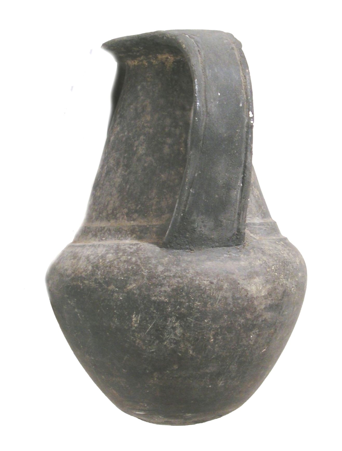 Anfora a vernice nera con alto collo cilindrico e corpo biconico, privo di base con larga ansa nastriforme,