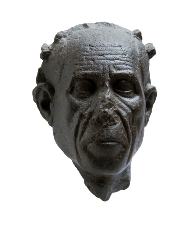 Il volto allungato ha i caratteri dell'età avanzata con la fronte solcata da rughe orizzontali incise e guance cavate con profonde pieghe che mettono in risalto gli zigomi. Gli occhi piccoli, leggermente a mandorla, hanno spesse occhiaie, mentre la bocca grande è serrata. Le orecchie emergono dalla calotta dei capelli che mostrano un'ampia stempiatura su cui poggia una coroncina di fiori. Sul retro rimane la parte superiore di un pilastro di sostegno. La testa rientra nel gruppo della ritrattistica dal forte realismo di periodo greco-tolemaico dall'Egitto del pieno I secolo a.C.