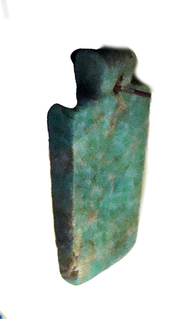 Amuleto in turchese lavorato a tutto tondo, raffigurante una tavoletta per scrivere liscia e rettangolare, con presa superiore forata. Amuleti di questo tipo si diffusero a partire dalla XXVI dinastia (dal VII secolo a.C.).