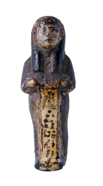 Statuina funeraria mummiforme. Indossa una parrucca tripartita nera. Le mani incrociate ed affiancate non sembrano reggere attrezzi. Il viso e le mani sono bianchi, il resto del corpo è quasi nero. L’iscrizione consta di una colonna di geroglifici, purtroppo quasi incomprensibile.