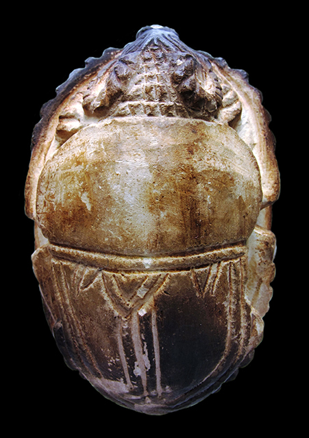 Scarabeo in steatite grigia con sul ventre raffigurazione di due personaggi maschili col cranio rasato e ureo sulla fronte. Quello a sinistra tiene un ankh nella mano destra e con l’altra porge un’anatra al secondo, il quale ha un ankh in una mano e una benda nell’altra. Dietro il capo di quest’ultimo vi sono dei segni geroglifici, forse un nome regale. Dorso con un’elaborata testa d’ariete e doppia incisione a T che separa protorace ed elitre. In basso si vede l’inizio del foro longitudinale, mai completato. Autenticità dubbia.
