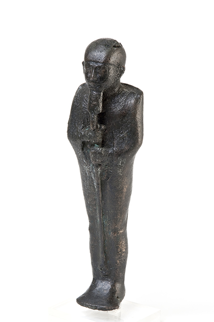 Il dio creatore di Menfi è usualmente raffigurato mummiforme, avvolto strettamente nel lenzuolo funebre, il cui lembo si nota dietro le spalle del dio. Sul capo la calotta, al mento la barba divina, corta e larga alla base. Con le mani, che spuntano fuori dal lenzuolo, regge il lungo scettro uas. Ulteriori particolari che compaiono sono il collare a più giri di perline, con il suo contrappeso dietro il collo, e l’intreccio della barba. La resa dell’anatomia, armoniosa ed elegante, permette di datare la statuina alla XXVI dinastia (672-525 a.C.).