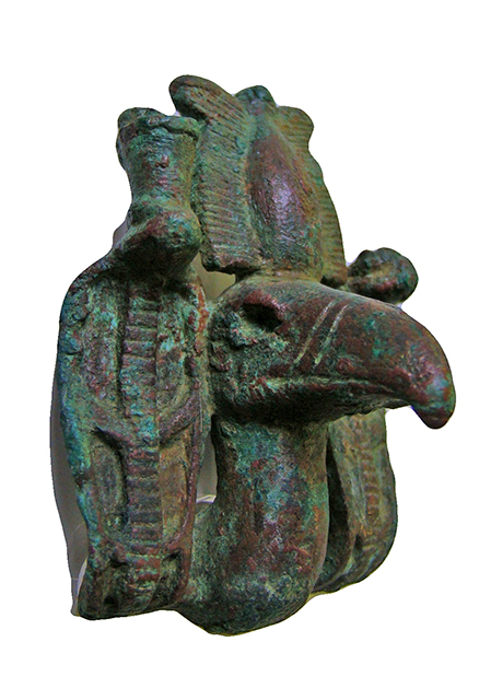 Applique in bronzo conformata a testa di avvoltoio con corona doppia, affiancato da due urei con disco solare, il cui corpo doveva originariamente essere decorato da paste vitree policrome. Era probabilmente applicata in corrispondenza della fronte ad una corona, reale o scolpita come parte di una statua a grandezza naturale o poco maggiore del vero.