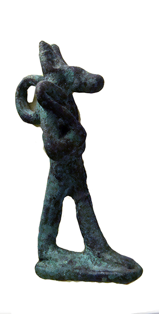 Amuleto in bronzo raffigurante il dio Anubi. Il dio dalla testa di sciacallo è raffigurato in piedi, nell’atto di camminare (con la gamba destra in avanti) e con le braccia stese lungo i fianchi; le mani sono chiuse a pugno. Le orecchie sono molto evidenti, così come il muso canino allungato. Indossa un corto gonnellino. Data la minutezza della figura, i piedi poggiano su una piccola base parallelepipeda, mentre dietro al collo vi è un anello di sospensione.