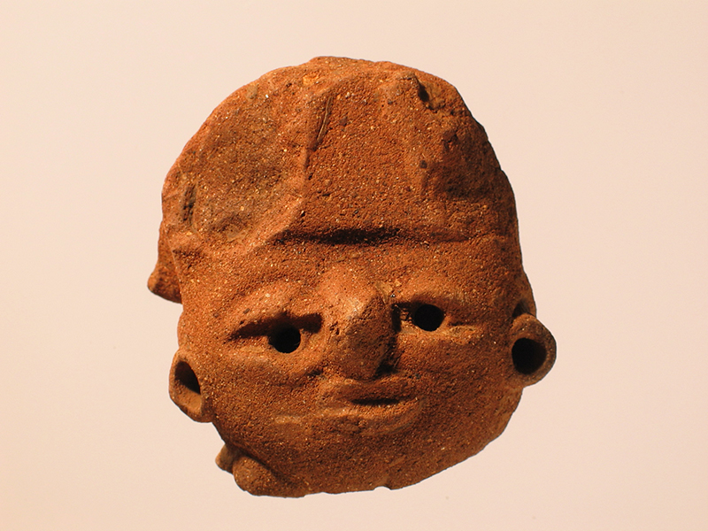 Piccola testa umana di stile Usulután modellata a pasta piena con le fattezze di un personaggio importante. I tratti del viso appaiono tutti molto ravvicinati e resi in modo schematico. Il volto mostra una forma tondeggiante mentre la fronte è appiattita e dominata da un copricapo in gran parte danneggiato. È ancora visibile, nella parte anteriore, la grande placca rettangolare che ornava il davanti del copricapo, con i due nastri pendenti in rilievo. La collana a grosse perle che cingeva il collo resta solo in tracce; integri gli ornamenti auricolari a cerchio con ampio foro al centro.