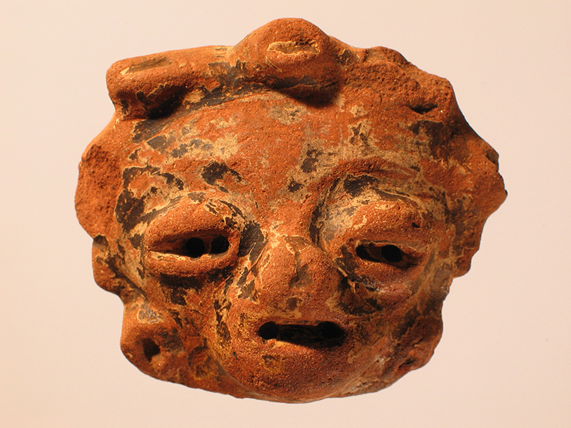 Rappresentazione plastica di stile Usulután di una testa umana, modellata con pasta di argilla piena. L’oggetto fa parte della cospicua produzione di figurine fittili. La loro abbondante presenza nei contesti archeologici viene spiegata da alcuni con l’ipotesi che fossero oggetti di culto legati alla fertilità. L’oggetto è integro e poggia su una base piatta posta sotto al collo; questo non reca tracce di frattura. Dopo essere stata plasmata a mano, la testina è stata ingobbiata e quindi dipinta. Sono ben visibili, malgrado le abrasioni della superficie, le tracce della patina decorativa esterna più scura, mista a tracce di pittura bianca. Il volto è caratterizzato da occhi con palpebre in rilievo e iride perforato. Anche il naso e la bocca sono molto sporgenti. Ai lobi sfoggia orecchini circolari. La fronte è larga e schiacciata. Il copricapo è abbellito da una testa di animale affiancata da elementi in rilievo che potrebbero rappresentare delle ali. Il retro della figura è piatto.