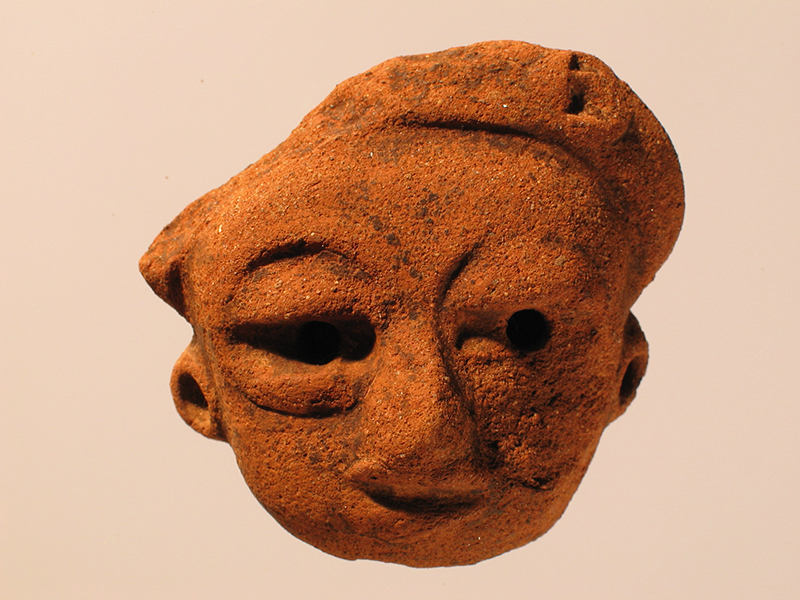 Miniatura fittile di stile Usulután raffigurante una testa umana. Realizzata a pasta piena, poggia su una base irregolare. I tratti del viso, seppure sommari, sono efficaci. Gli occhi hanno le palpebre in rilievo e un profondo foro al posto dell’iride, in questo probabilmente era incastonato un frammento di altro materiale decorativo. Anche gli orecchini presentano un foro analogo. La fronte sembra cinta da un’ampia fascia di tessuto a torciglione, come è ancora in uso presso alcune etnie dell’area Maya. Sulla superficie resta qualche traccia dell’ingobbio annerito.