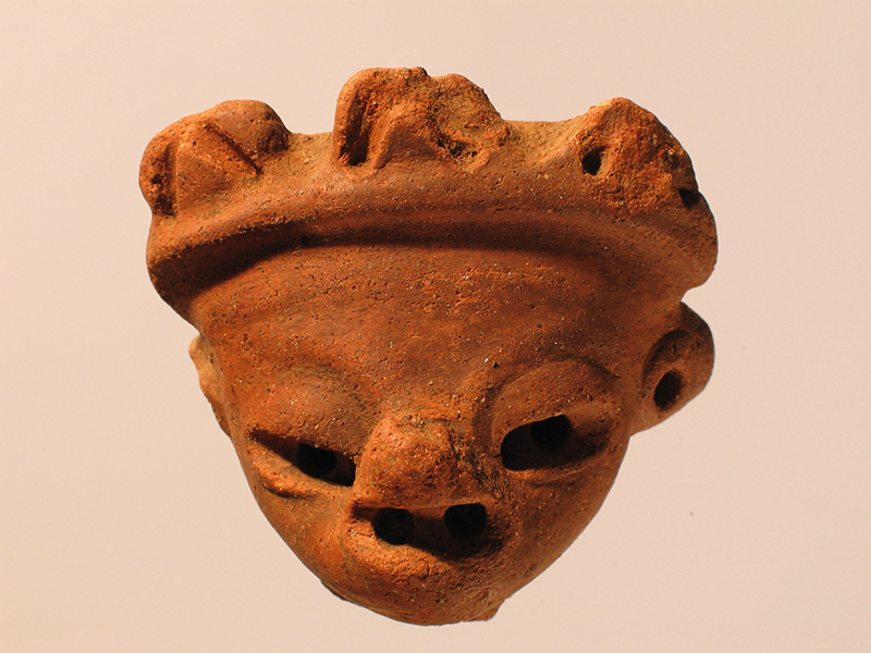 Elegante testina umana di stile Usulután di terracotta ingobbiata e levigata, forse appartenente ad una figurina intera. La forma del viso è quasi triangolare, con fronte larga e appiattita, bordata in alto da una fascia orizzontale sporgente. Al di sopra di questa sono disposti, come una corona, tre elementi in rilievo decorati da una scanalatura a V rovesciata. Gli occhi sono forati al centro così come gli orecchini, mentre sulla bocca sono stati praticati due fori distanziati. L’oggetto è stato rivestito da una ingobbiatura di colore arancio rosato e infine levigato. Il retro è piatto.