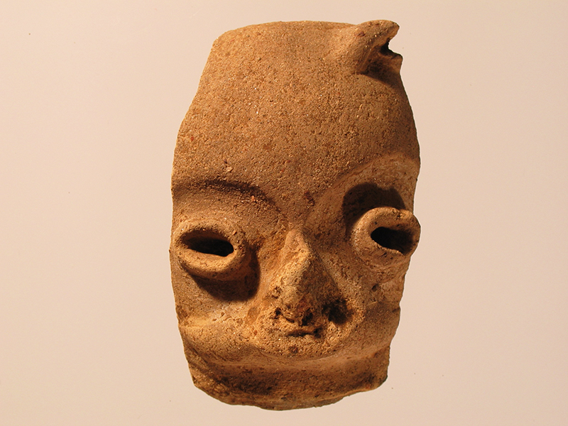 Frammento di vaso configurato di stile Usulután. Si tratta di una porzione del collo di un vaso che raffigura una testa antropomorfa. La parte interna del frammento è concava. La superficie esterna è di colore grigio, effetto ottenuto mediante cottura ossidoriducente che impedisce l’ossidazione dei minerali argillosi. Il volto è reso con pochi tratti essenziali: gli occhi di forma ovale, hanno il contorno a rilievo, il naso e la bocca, anch’essi sporgenti, sono in parte scheggiati. La fronte è liscia e si incurva verso l’alto seguendo la convessità della parete esterna. In alto termina con un orlo arrotondato.