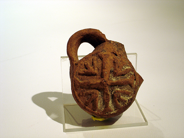 Ampolla piatta in argilla nocciola rosata, priva del collo e di un’ansa, con una fenditura alla base del collo sul lato A. Ottenuta da matrice abbastanza fresca. Sulla faccia A, entro un medaglione delimitato da un solco poco profondo, vi è l’immagine di San Menas orante tra i due cammelli, con due croci ai lati della testa del santo. Sulla faccia B vi è invece una croce apicata e raggiata.