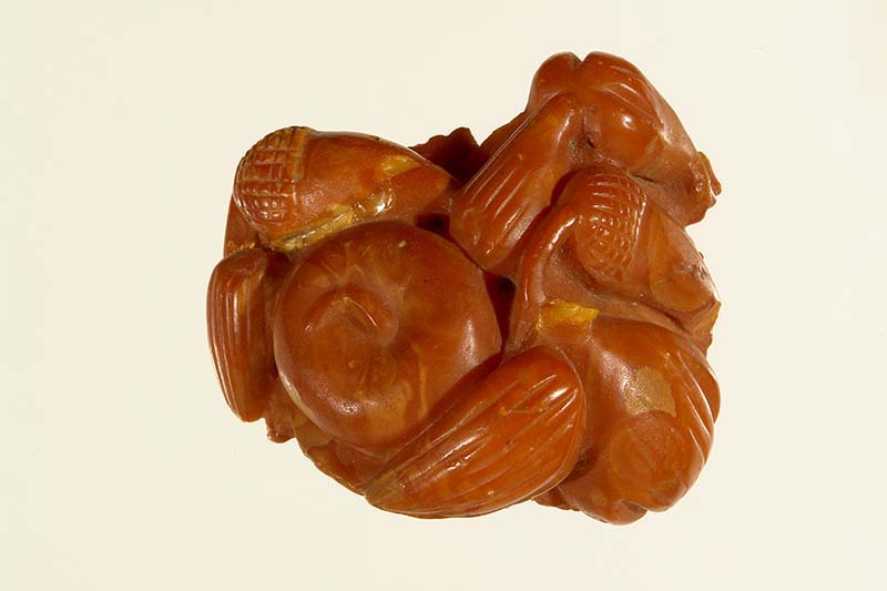 Bibelot a tutto tondo reso in modo naturalistico in un blocco d'ambra giallastra lucida: composizione di 8 frutti ad altorilievo (3 mandorle, 2 ghiande, 2 fichi e una mela) posti su una foglia di vite polilobata, dalle nervature incise e forellini lungo l'orlo seghettato. Il gambo della foglia ripiegato forma un piccolo anello. La foglia è lavorata accuratamente anche al rovescio, sul piano di posa, che non avrebbe dovuto essere visto.