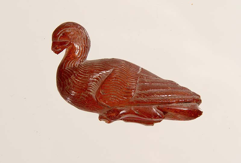 Figura di animale a tutto tondo, in ambra rossastra intagliata, dalla resa naturalistica: un volatile - probabilmente un'ochetta - accovacciato tiene la testa eretta rivolta in avanti. Le ali ripiegate hanno un folto piumaggio.