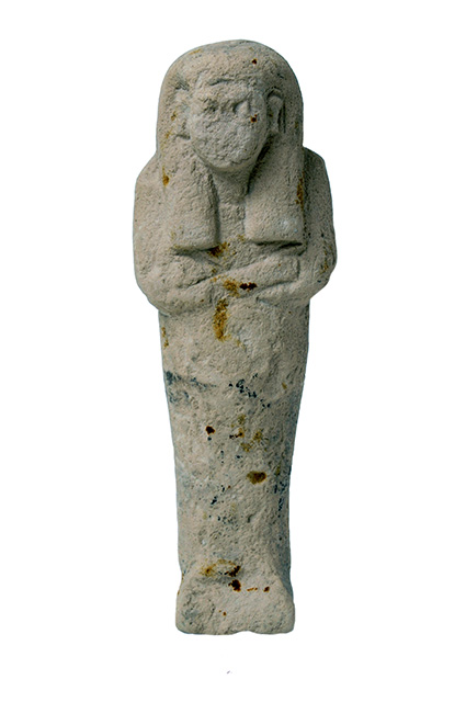 Statuina funeraria mummiforme che indossa una parrucca tripartita. Le mani sono incrociate, la destra sopra la sinistra, e sono senza attrezzi. L’ushabti è privo di iscrizione, ma ciò potrebbe essere dovuto alla perdita della pittura originale, che doveva essere a fondo giallo.