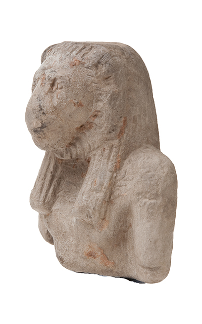 Parte superiore di una statuina in arenaria che raffigura la dea Sekhmet, corrispondente al busto e spezzata sotto il seno. L’iconografia è quella consueta, di donna con testa di leonessa. Il muso felino è modellato con cura, per quanto si può vedere, e la parrucca tripartita è segnata da linee verticali parallele. Non si distinguono altri dettagli.