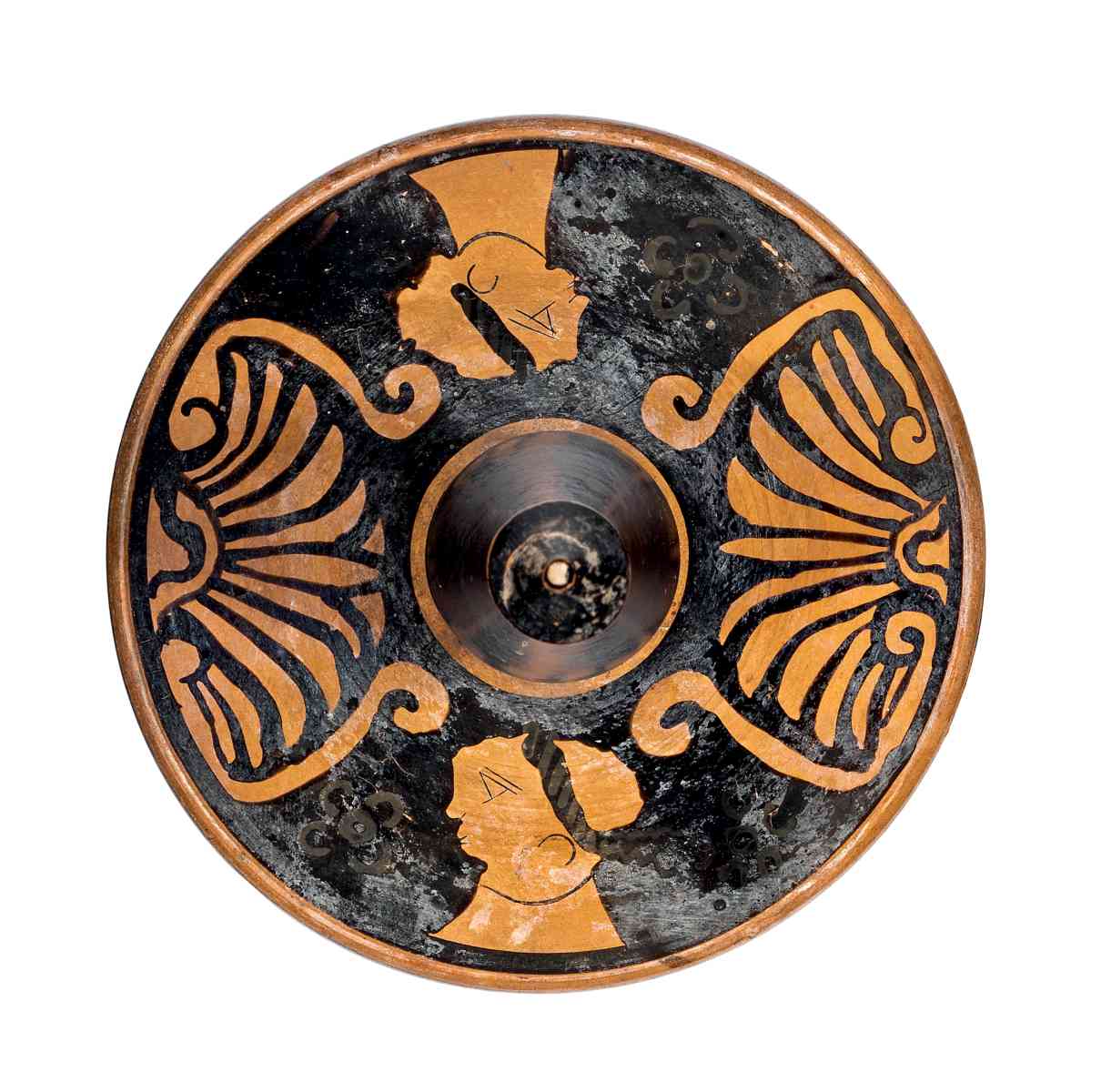 Argilla giallo rossastra (5 YR 6/6 Munsell); vernice lucente, di buona qualità, ben conservata e con scalfitture pressoché inesistenti. Il coperchio è appena coperto, in alcune piccole zone, da una leggera patina e presenta un'unica presa centrale sormontata da una piccola protuberanza di forma conica. L'apparato decorativo è costituito da due busti maschili uguali, di profilo verso sinistra. I busti sono caratterizzati da un naso molto pronunciato, soprattutto per la sporgenza all'altezza della fronte; dai capelli ridotti ad una sola striscia di ciocche attorcigliate su sé stesse, che lasciano scoperta la parte superiore del cranio come in una chierica da frate; infine, da un collo molto tozzo, quasi un tutt'uno con il busto sottostante. Si alternano a questi busti due palmette tra girali. Gli spazi tra le palmette e i busti stessi sono arricchiti entrambi con un fiorellino stilizzato con corolla centrale a quattro o cinque petali, reso mediante sovraddipintura, la quale, tuttavia, risalta poco rispetto alla vernice nera di fondo, appena più scura. Il resto della decorazione accessoria è costituito invece da una sottile fascia risparmiata tra il coperchio e l'attacco del manico, da due ulteriori filetti risparmiati che sottolineano superiormente e inferiormente la decorazione principale, e da una baccellatura che arricchisce il bordo esterno del coperchio. Il coperchio è tradizionalmente associato al lebete del Pittore del Primato con inventario 1811. Nonostante la forma sembri genuina, a causa delle tracce di lavorazione che indicano l'uso di un tornio elettrico, nonché della qualità e del tipo di decorazione (in cui le sovraddipinture coprono la patina fluorescente, che invece dovrebbe essere il risultato delle condizioni di giacitura e quindi posteriore), Bellinato ritiene che questo coperchio sia il prodotto di un artigiano che operò probabilmente nel XIX secolo dell'era moderna.